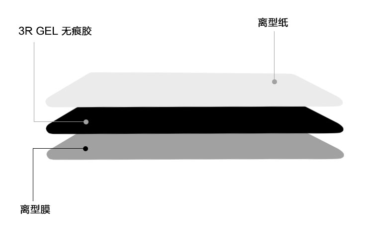 上圖雙面可移膠,由離型膜與3R GEL無痕可移膠組成,可做無基材與有基材兩種,上圖為無基材產(chǎn)品